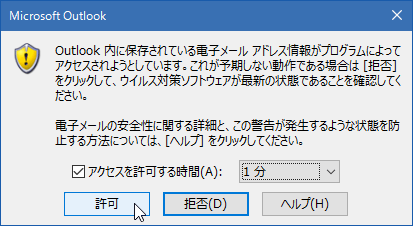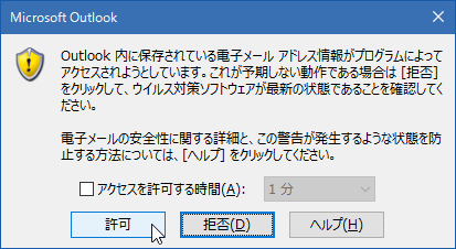 実行時、セキュリティ上、プログラムがOutlookにアクセスしても良いかどうか確認するメッセージボックスが表示されるので[はい]を選択しないとプログラムの実行が進まない。