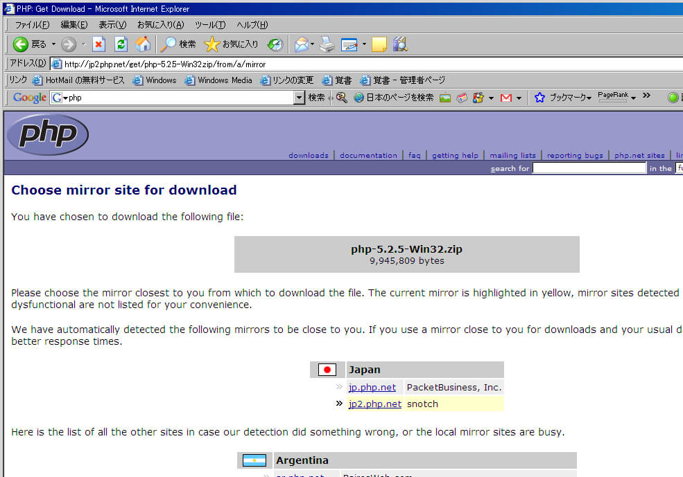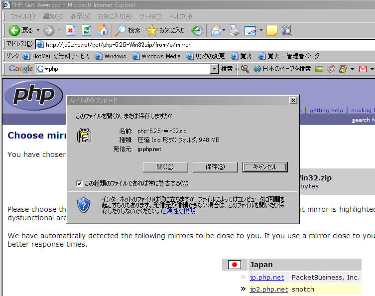 「Japan」のjp.php.net をクリックし、PHPのzipパッケージをダウンロードする。