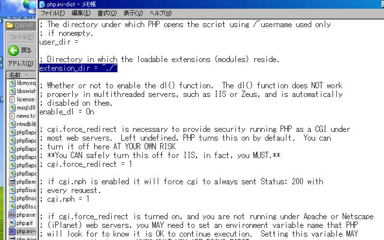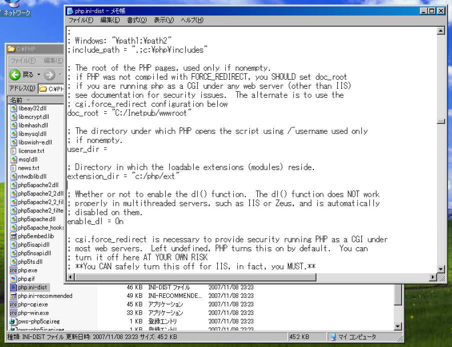 "C:\PHP"フォルダにあるphp.ini-distをメモ帳で開く。