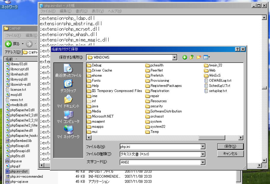 [名前をつけて保存]ダイアログボックスが開くので保存先に"C:\Windows"を指定し、ファイル名を"php.ini"に変更して[保存]をクリックしてメモ帳を閉じる。