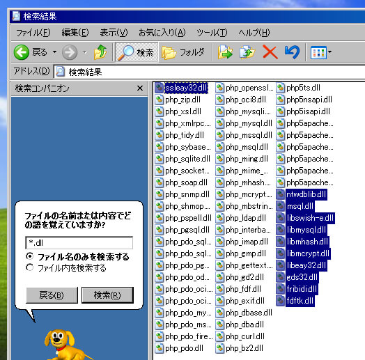 php*.dll以外のDLLのコピーは、Windowsのファイル検索機能で"c:\php"フォルダを指定して"*.dll"を条件に検索をかける。