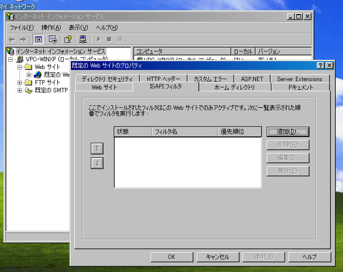 次に[規定のWebサイトのプロパティ]ダイアログボックスの[ISAPIフィルタ]タブをクリックする。