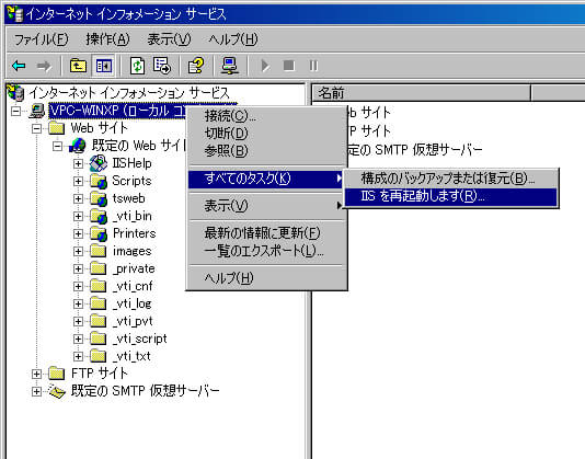 [インターネットインフォメーションサービス]の画面に戻ったら、ツリーの[コンピュータ名(ローカルコンピュータ)]を右クリックし、ショートカットメニューの[すべてのタスク]をポイントし、[IISを再起動します]をクリックする。