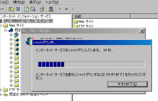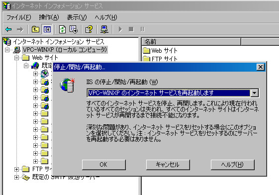 [停止/開始/再起動]ダイアログボックスが表示されるので[コンピュータ名のインターネットサービスを再起動します]を選択し[OK]をクリックしてIISを再起動する。