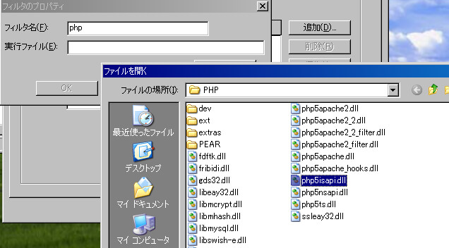 "C:¥PHP"フォルダを参照し、ファイルの一覧から"php5isapi.dll"を選択して[開く]ボタンをクリックする。