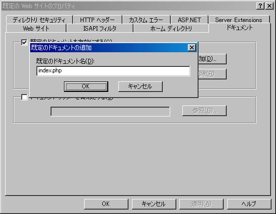 [規定のドキュメントの追加]ダイアログボックスが開くので[規定のドキュメント名]ボックスに"index.php"と入力し、[OK]をクリックする。