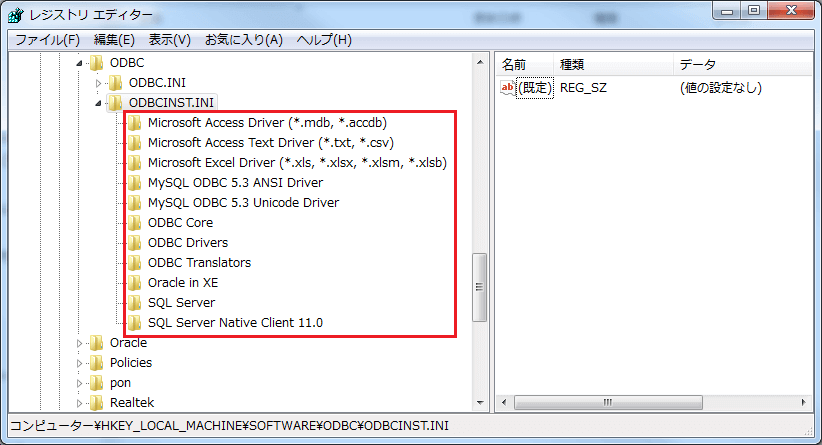 レジストリエディタを起動して"HKEY_LOCAL_MACHINE\SOFTWARE\ODBC\ODBCINST.INI"のキーを参照します。