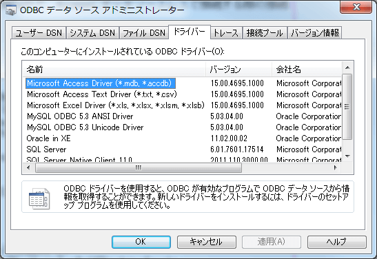 上記の何れかの方法で確認するとAccessのODBCドライバ名は、