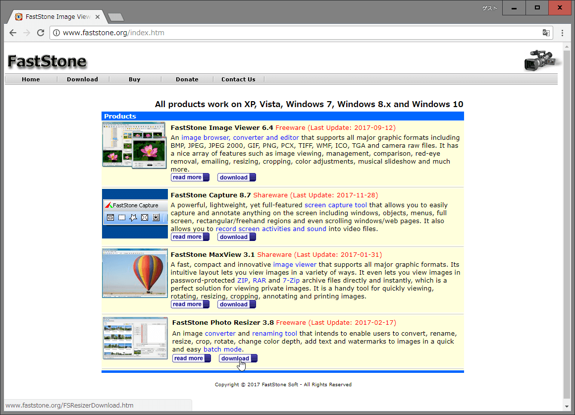FastStone Photo Resizer以外にも画面キャプチャソフトなども提供しています。