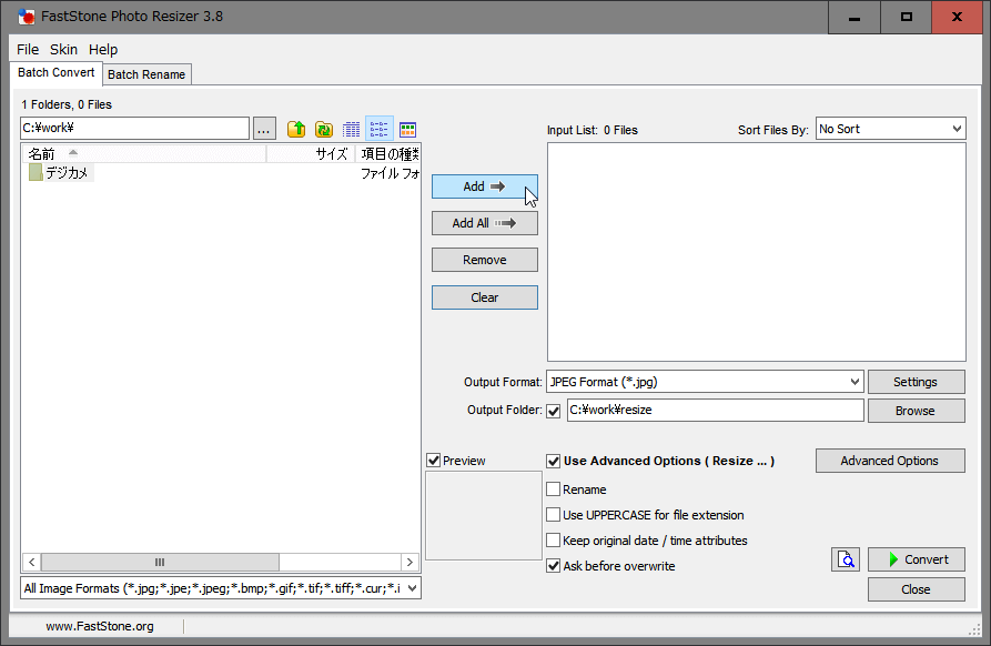 FastStone Photo Resizerを起動して圧縮したい画像ファイルを[Add]ボタンをクリックして追加します。