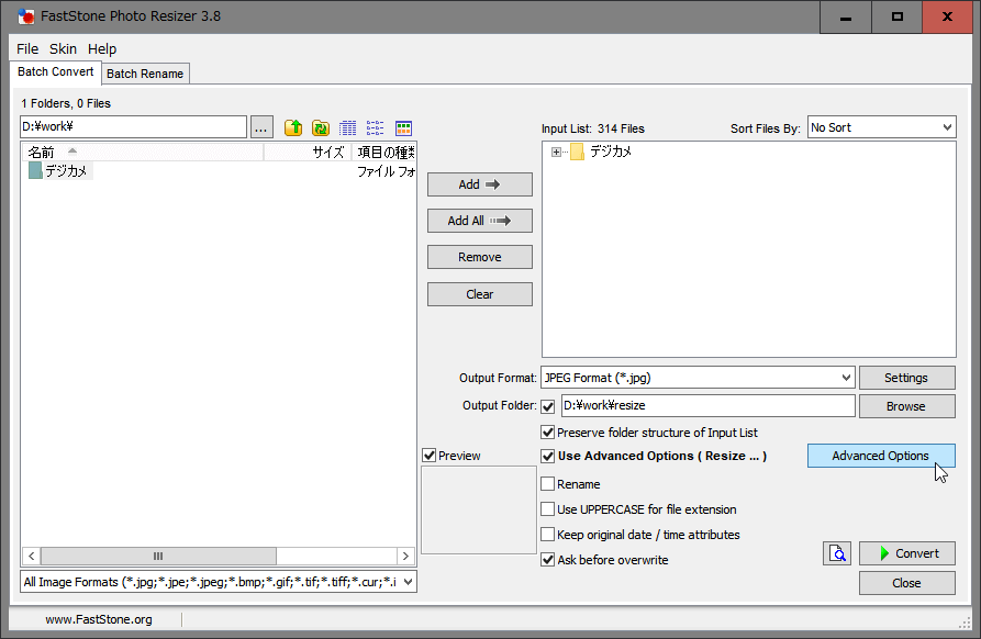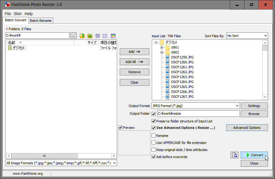 数枚ではなく大量にある画像を一括で変換する場合は、FastStone Photo Resizerを使うほうが効率的です。