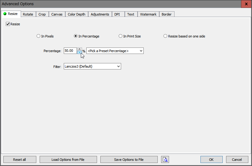 [Advanced Option]ボタンをクリックすれば、リサイズ指定などの追加設定が行なえます。