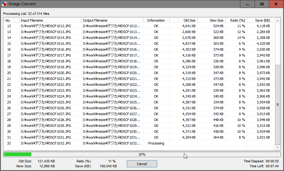 - リサイズも圧縮時に同時に行える オプションでリサイズ指定をしておけば圧縮と同時に実行