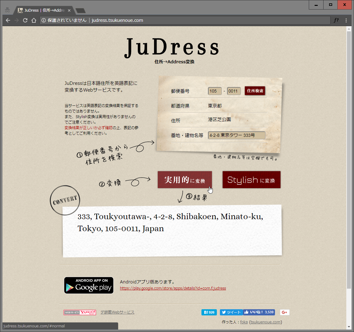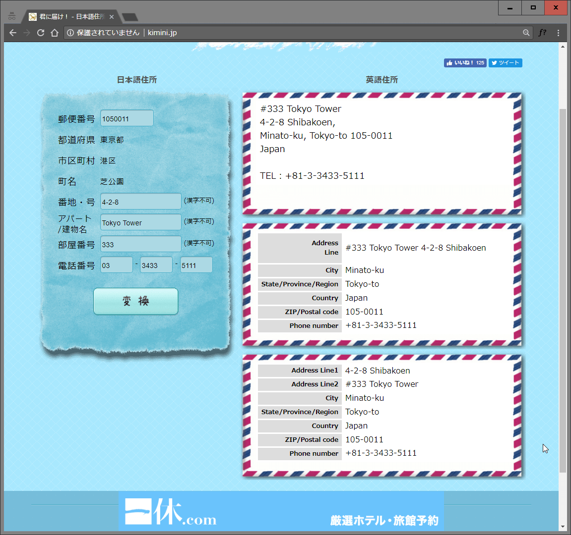 郵便番号と番地さえ入力すれば英語表記用の住所に変換してくれるWebサイト。