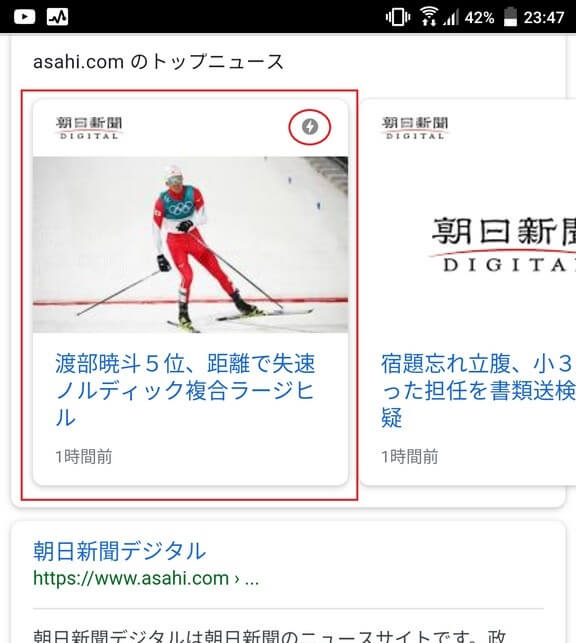 試しにスマホのブラウザで"朝日新聞"を検索してカルーセル表示(赤四角部分)されていて右上に稲妻マーク(赤○部分)のあるページをクリックしてみてください。 瞬時にページが表示されます。