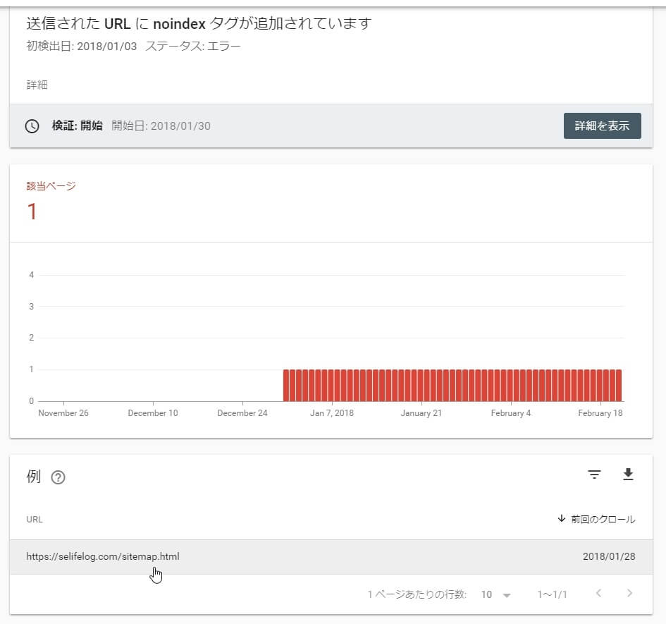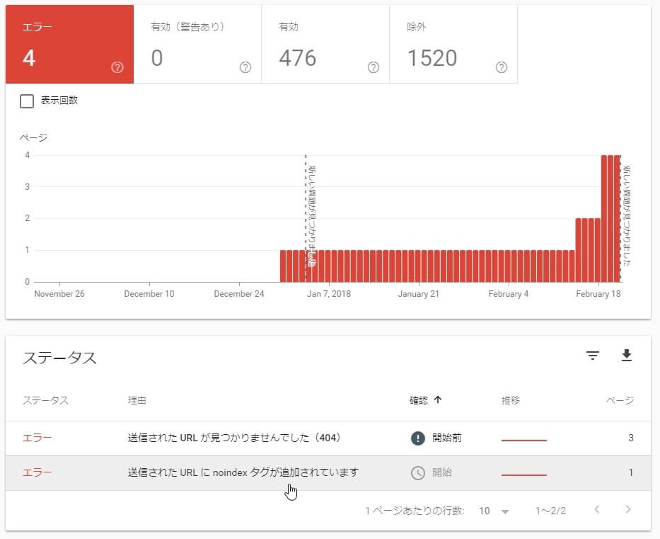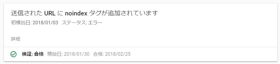 Google Search Consoleから「「インデックス カバレッジ」の問題が新たに検出されました」というメールが届いたので、Google Search Consoleで確認したところ、4件のエラーのうち1件が「送信された URL に noindex タグが追加されています」というエラーでした。