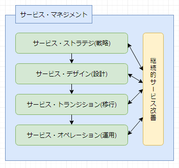 ITサービスに必要な各ライフサイクル、そしてその全てに関わる継続的サービス改善があり、それらを統合して成功に導くために管理/運営してことが「サービス・マネジメント」と言えます。