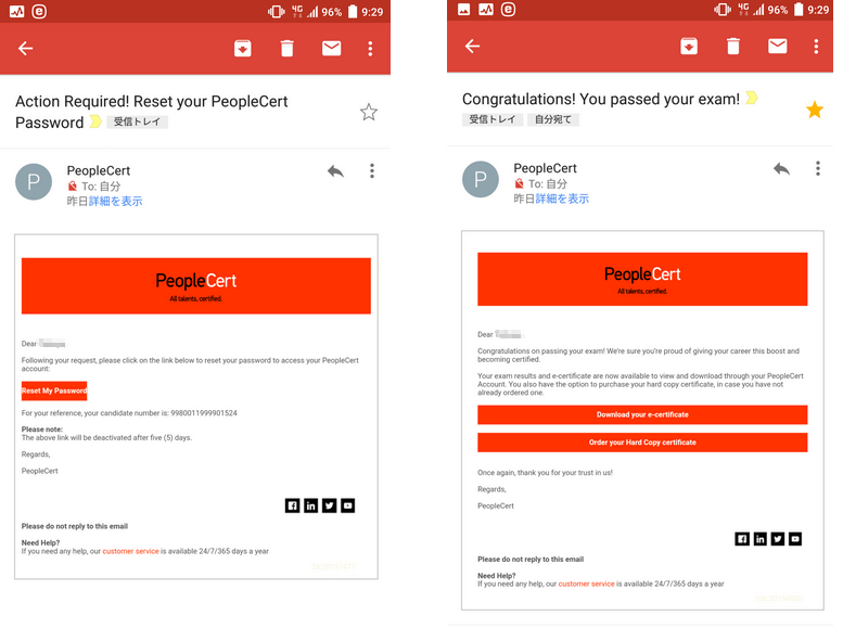 ITILに合格すると試験日から10日前後でPeopleCertから2通のメールが届きます。