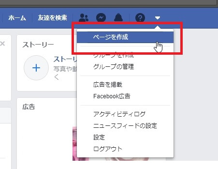 ログインしたら、画面右上の下三角ボタンをクリックし、[ページを作成]をクリックします。