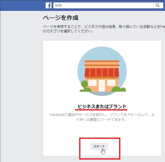[ページを作成]画面が表示されるので、「ビジネスまたはブランド」の下の[スタート]をクリックします。