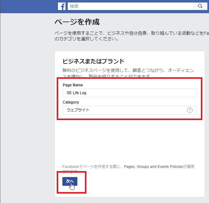 [Page Name]に作成するページの名前を入力し、[Category]テキストボックスに"ウェブ"と入力すると、カテゴリーの一覧に「ウェブサイト」が表示されるので「ウェブサイト」を選択します。