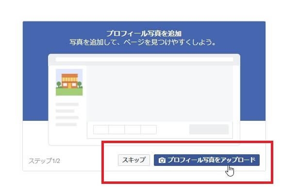 [カバー写真を追加]画面が表示されるので、プロフィール写真を設定する場合は、[カバー写真をアップロード]を選択します。