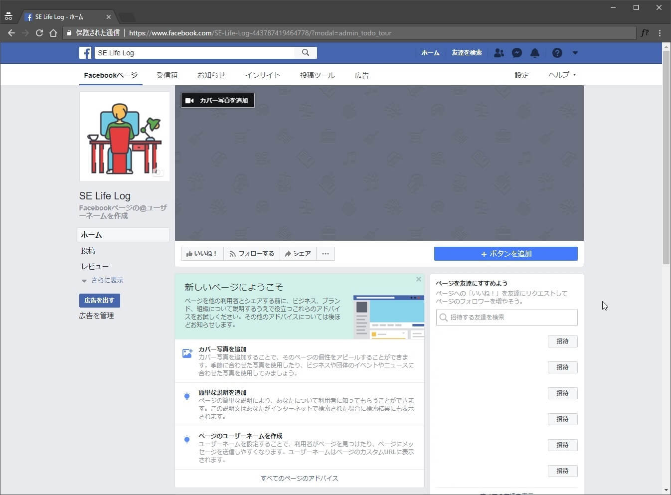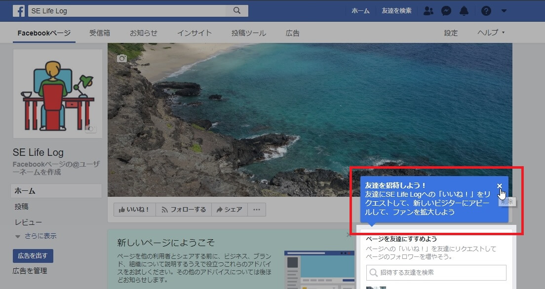 ページが作成されると「友達にすすめよう!」メッセージがポップアップされますが、絶対にすすめたりしないように!