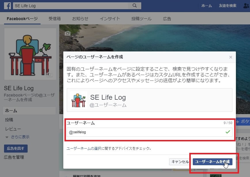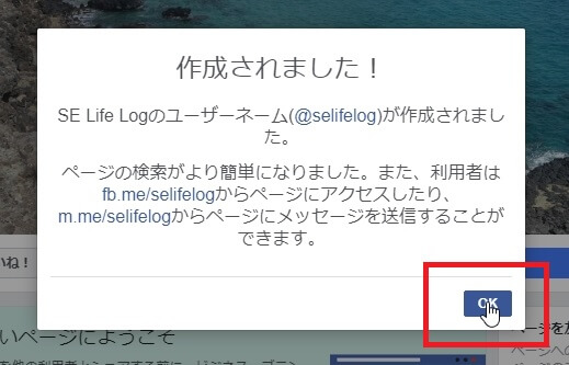 上記の設定により、作成したページのURLが「https://www.facebook.com/ユーザーネーム」になります。