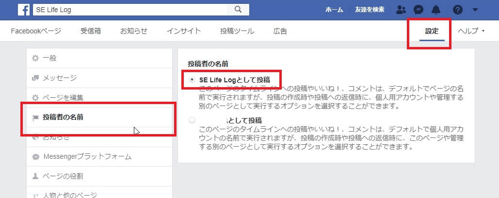 投稿者の名前設定を行うことで自分のアカウントからではなく、作成したFacebookページとして投稿ができるようになります。