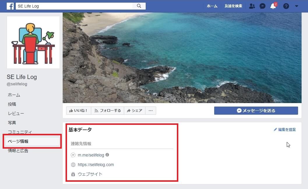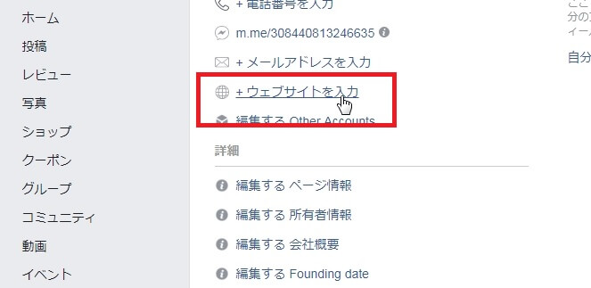 これで作成したFacebookページのウェブサイトとしてブログのURLが登録されます。