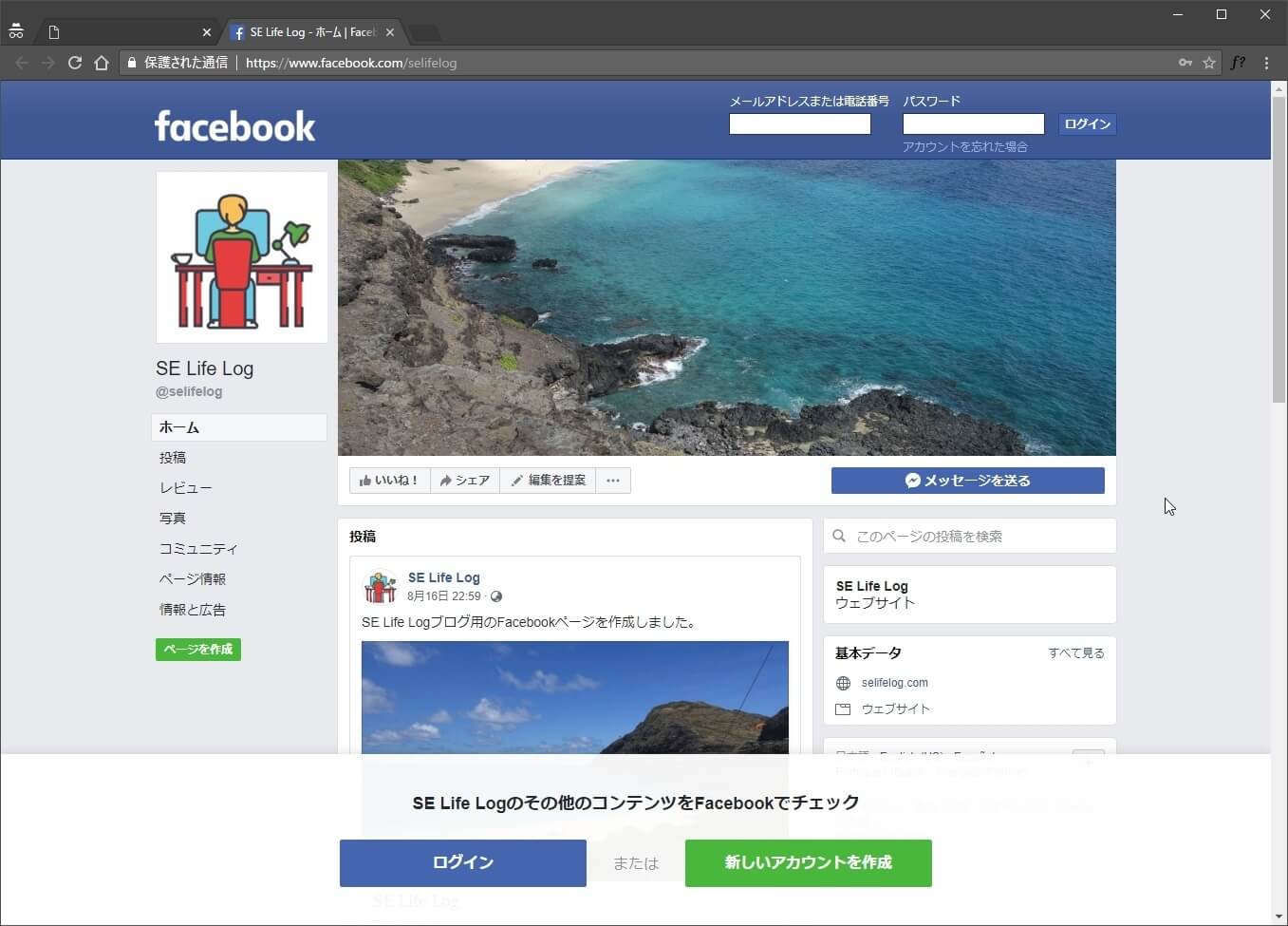 作成したFacebookページがまったくの他人からFacebookを通してどう見えるのか、本当に本人のアカウントに関連するような情報が見えないのか確認してみました。