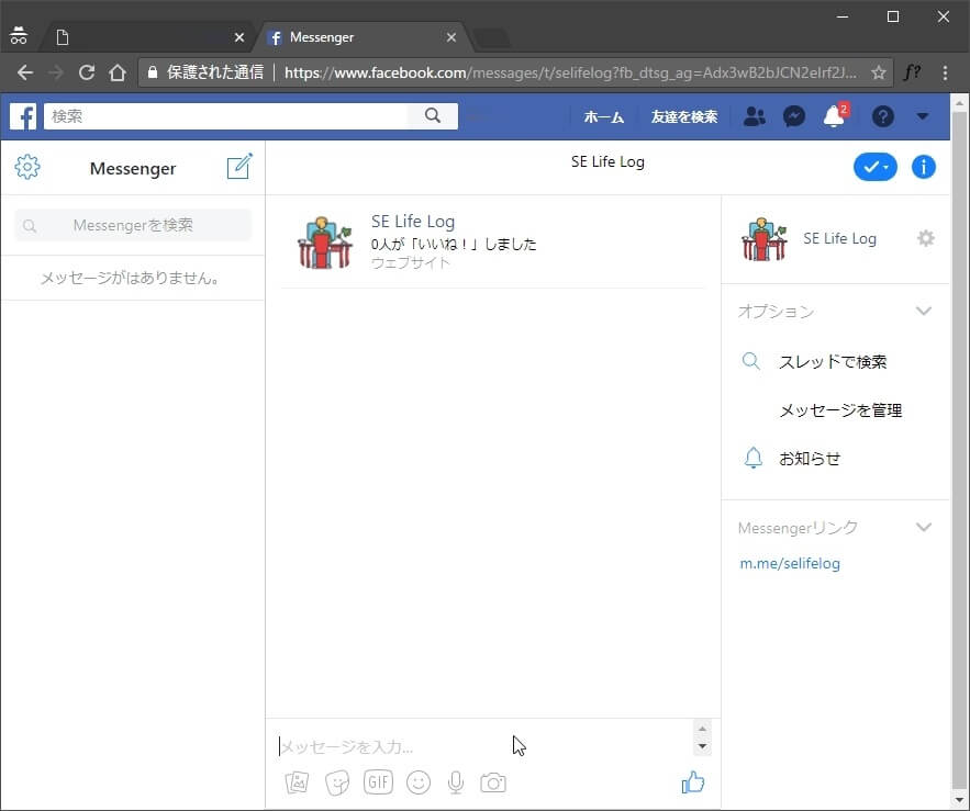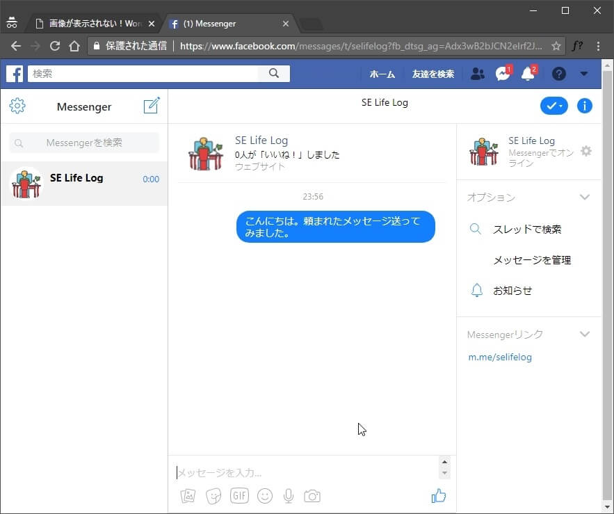 管理者側からメッセージを返信したあとの他人側のMessenger画面です。