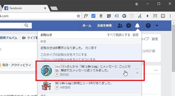 受け取った本人(ページの管理者)側のFacebookに以下のように通知が来ます。
