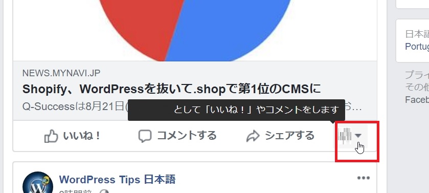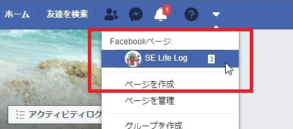 以下のように下三角ボタンをクリックするとユーザーを切り替えることができますので、Facebookページ側に切り替えます。