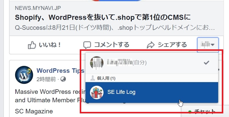 こうすることで以下のように自分のFacebookページの中の人として「いいね!」や「シェア」ができるようになります。