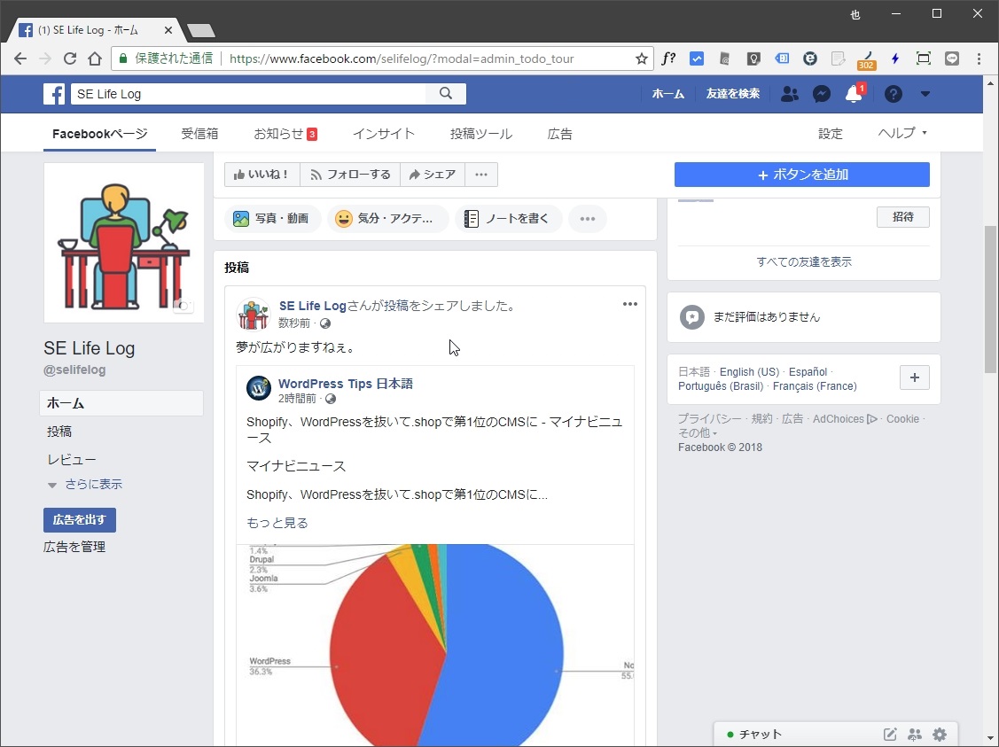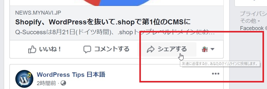 シェア投稿された実際の自分のFacebookページ画面はこんな感じです。