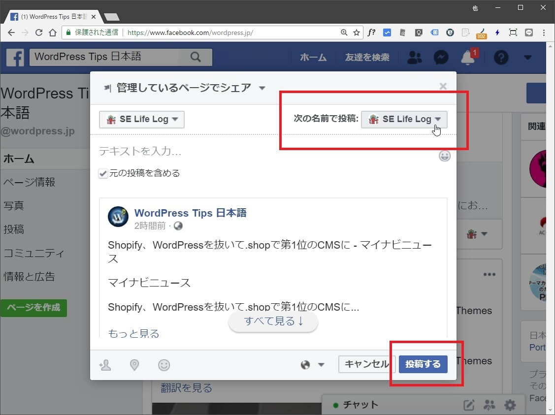 実際に自分のFacebookページに他の投稿をシェアする場合の例を以下に説明します。