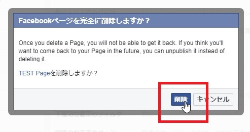 「Facebookページを完全に削除しますか?」メッセージが表示されるので[削除]をクリックします。