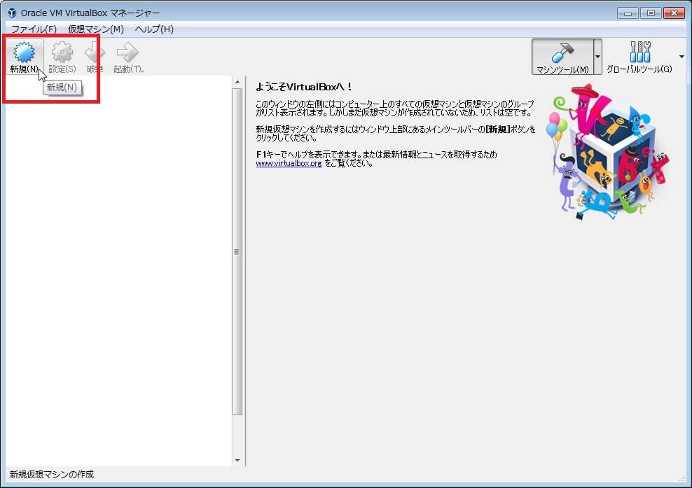 VirtualBoxを起動し、[Oracle VM VirtualBox マネージャー]画面が表示されるので、[新規]ボタンをクリックします。