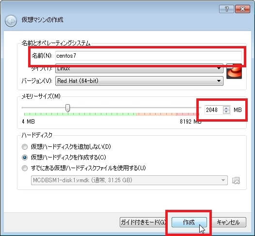 [仮想マシンの作成]画面が表示されるので、名前ボックスに任意の名前(ここでは、centos7)を入力し、[メモリーサイズ]には、2GB(2048MB)を入力して[作成]をクリックします。