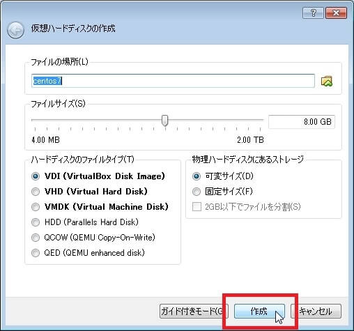 仮想マシンのファイルの場所の指定画面が出ますが、ここは特に何も変更せず[作成]ボタンをクリックします。