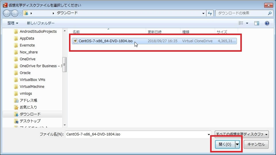[仮想光学ディスクファイルを選択してください]画面が表示されるので、ダウンロードしたCentOSのisoファイルを選択して[開く]をクリックします。