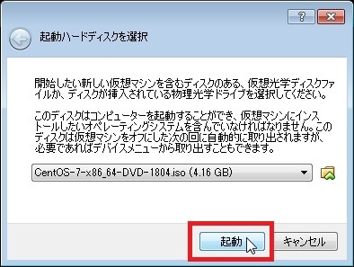 [Oracle VM VirtualBox マネージャー]画面に戻りますので、さきほど作成した”centos7”が選択して[起動]ボタンをクリックします。