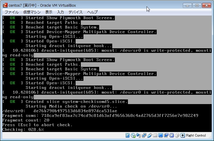 CentOSのインストールが開始され、画面にいろいろ表示されますがそのまま待ちます。