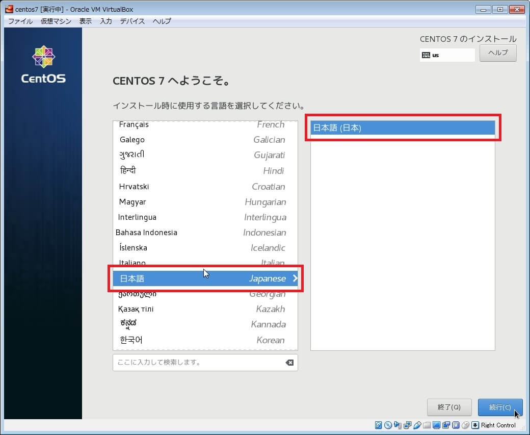 しばらく待つと[CENTOS 7へようこそ。]画面が表示されるので [インストール時に使用する言語を選択してください]の一覧から”日本語”、右のボックスから”日本語(日本)”を選択して[続行]をクリックします。