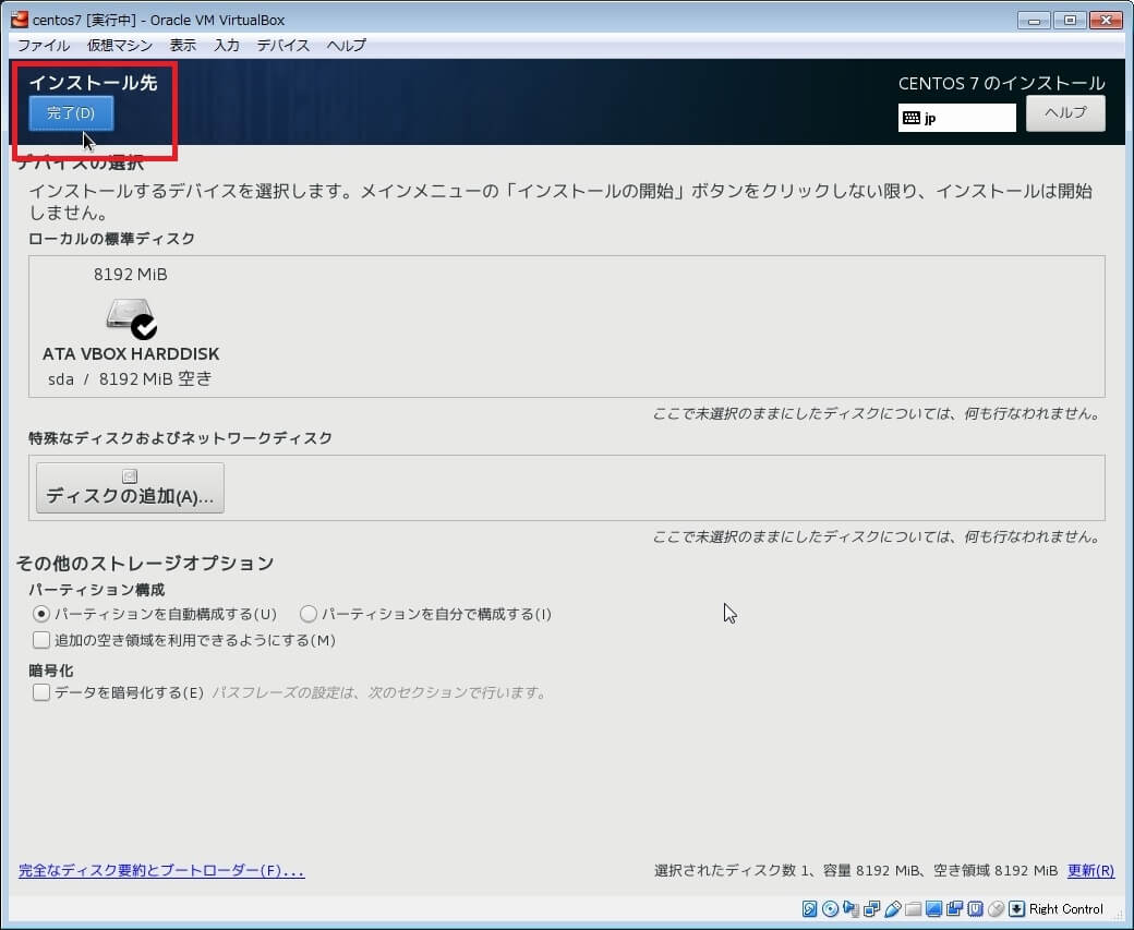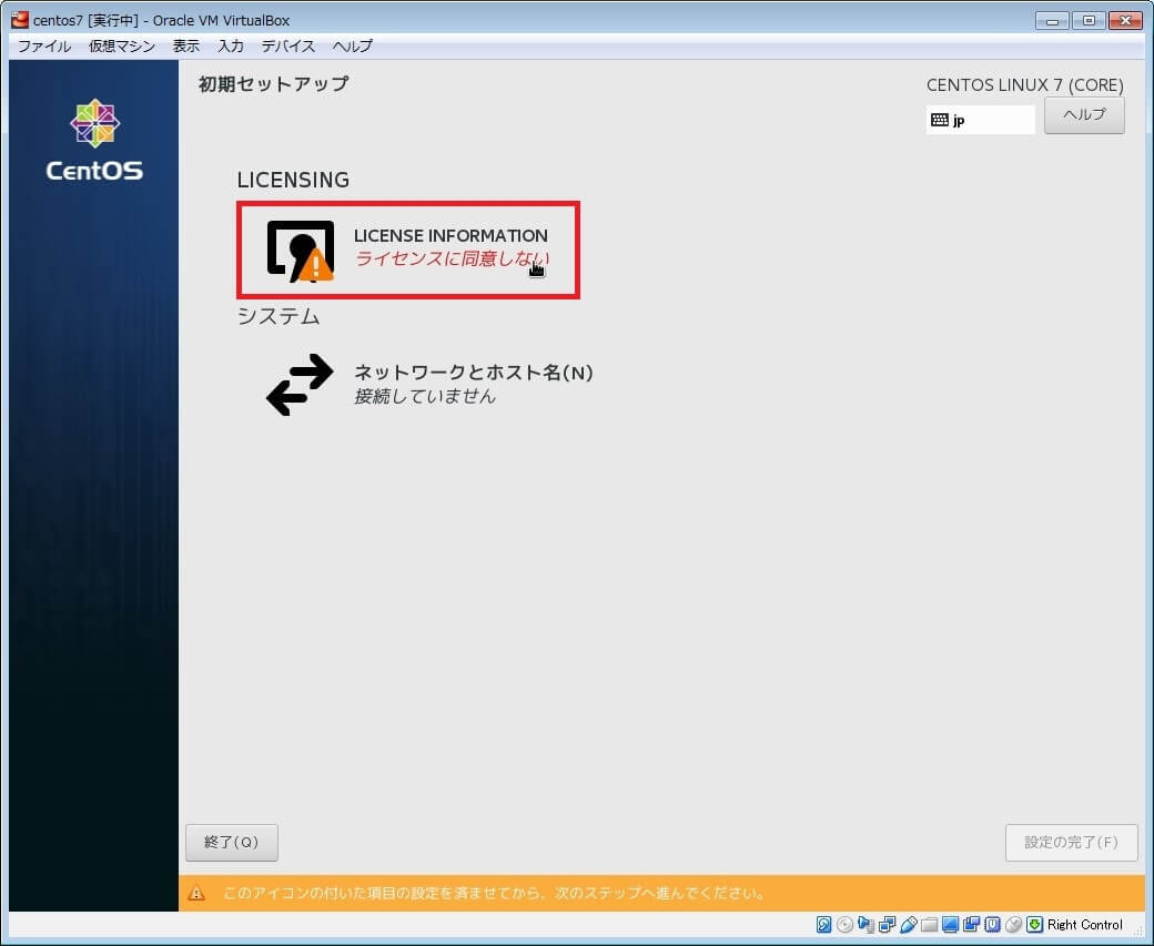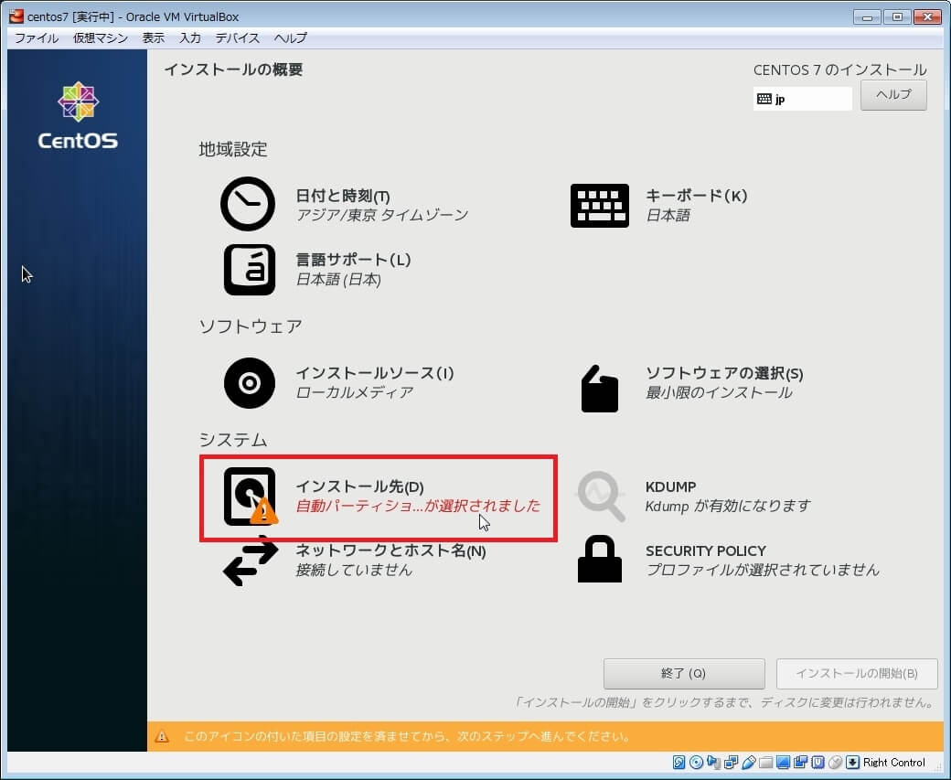 これでCentOSの仮想マシンの作成は終了ですが、まだちょっと続きがあります。