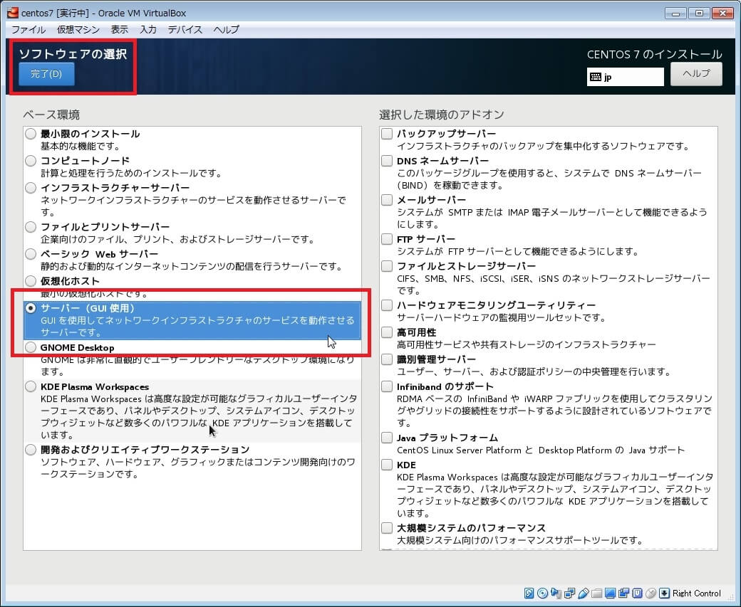 [ソフトウェアの選択]画面が表示されるので、[ベース環境]の一覧から”サーバー(GUI使用)”をオンにして[完了]をクリックします。