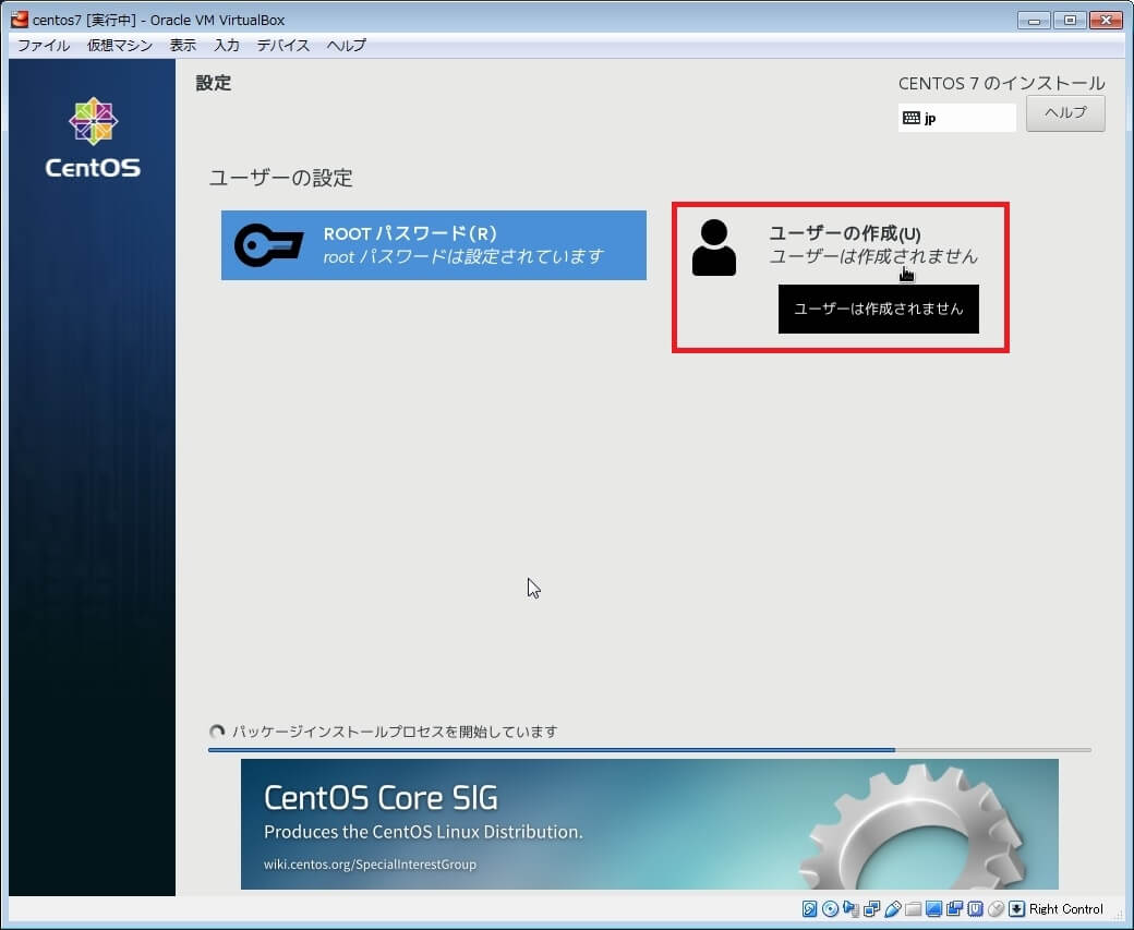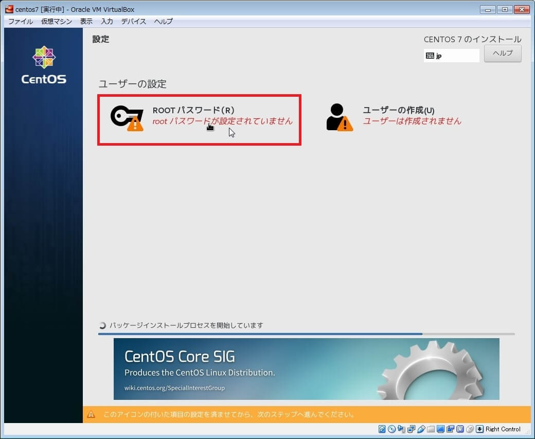 インストールプロセスが動作している間にROOTパスワード(rootユーザーのパスワード)の設定と一般ユーザーを1つ作成しておきますので、[ROOTパスワード]をクリックします。