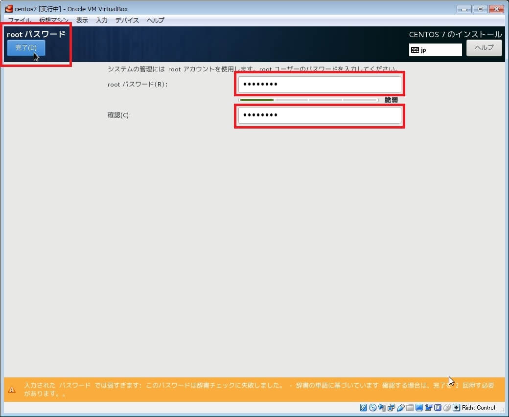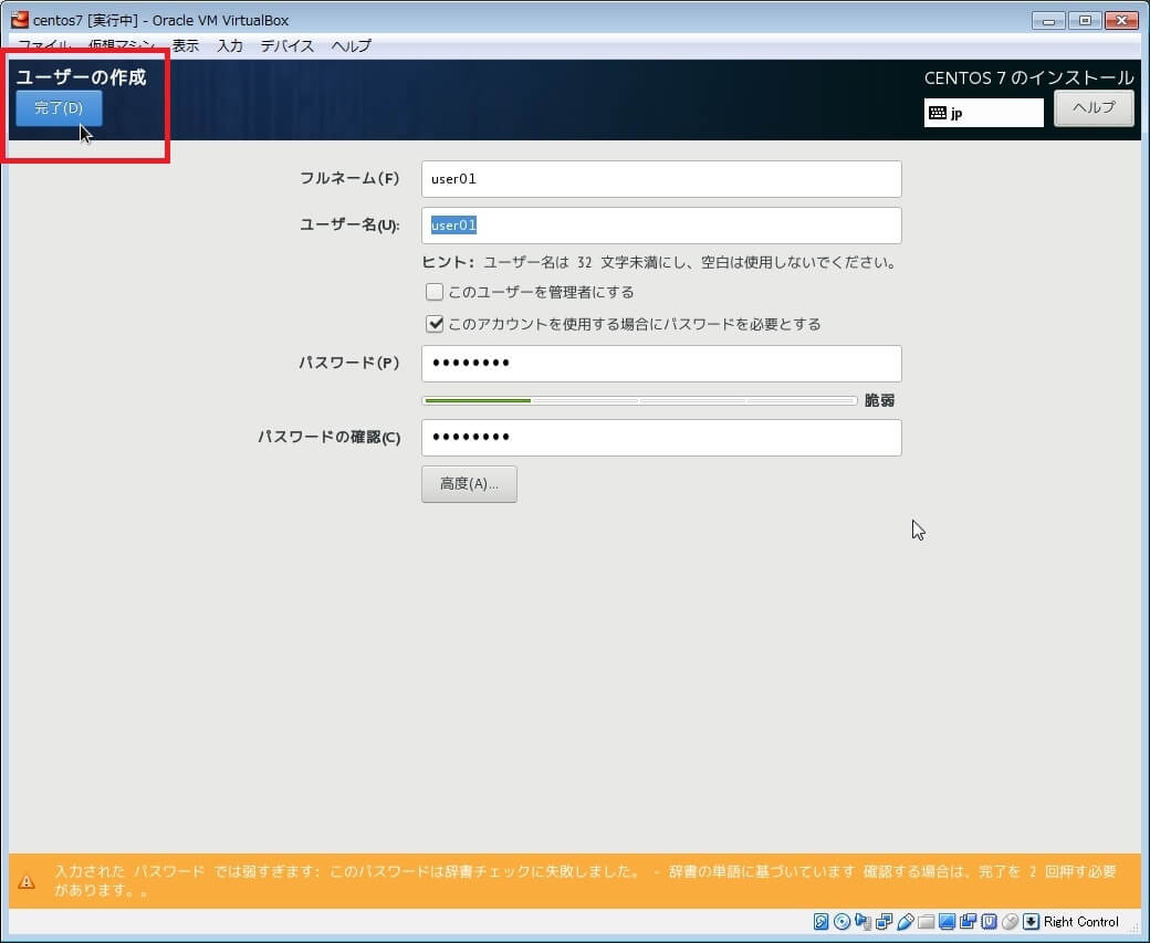 パスワードが単純(例えば、”password”など)なものに設定した場合は、[完了]を2回クリックする必要があります。