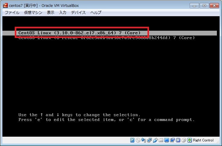 再起動されると以下のような画面が表示されますので、画面の中を一度マウスでクリックした後に一番上の「CentOS Linux (3.10.0-862.e17.x86_64) 7 (Core)」が選択されている状態で[Enter]キーを押します。